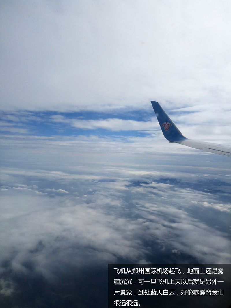 飛機從鄭州國際機場起飛,地面上還是霧霾沉沉,可一旦飛機上天以后就是另外一片景象,到處藍天白云,好像霧霾離我們很遠很遠。