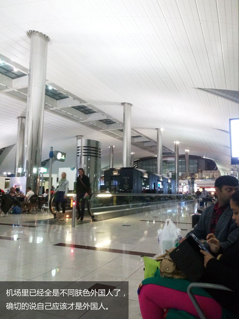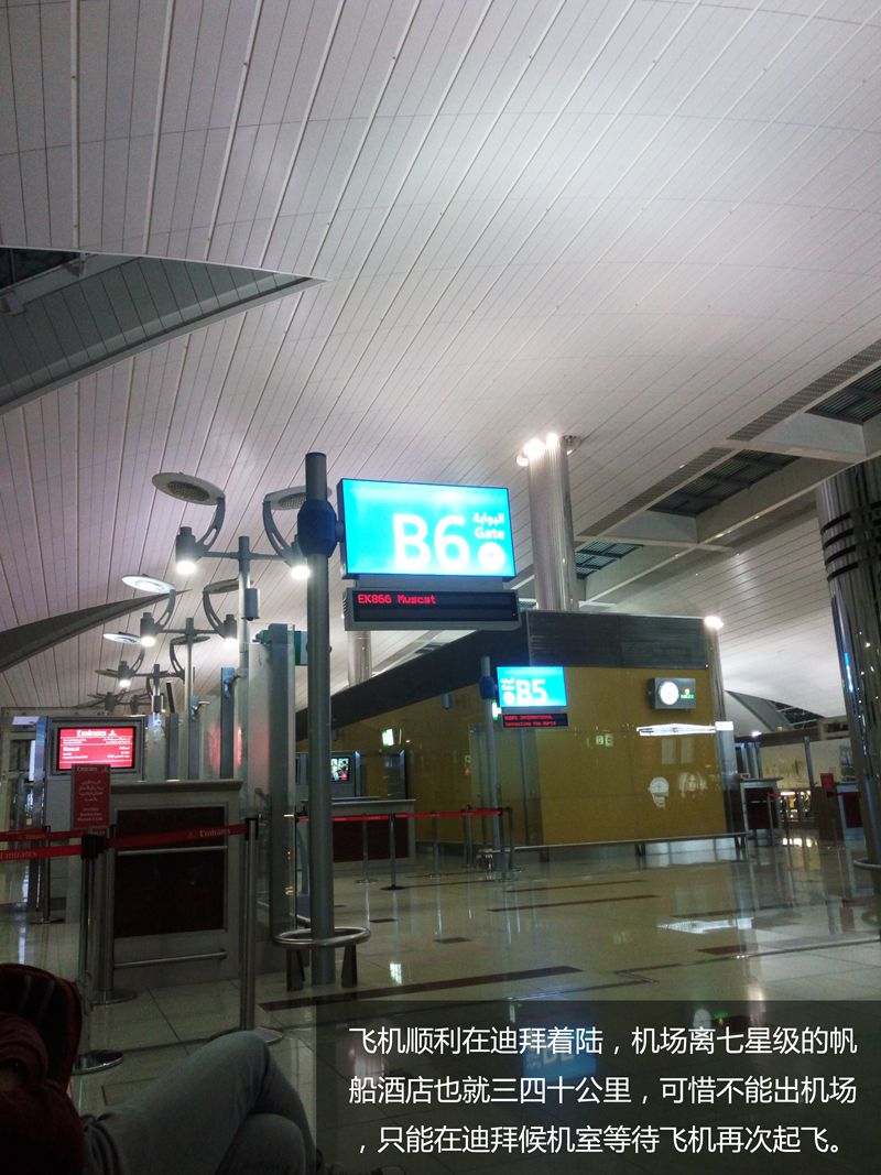 飛機順利在迪拜著陸,機場離七星級的帆船酒店也就三四十公里,可惜不能出機場,只能在迪拜候機室等待飛機再次起飛。