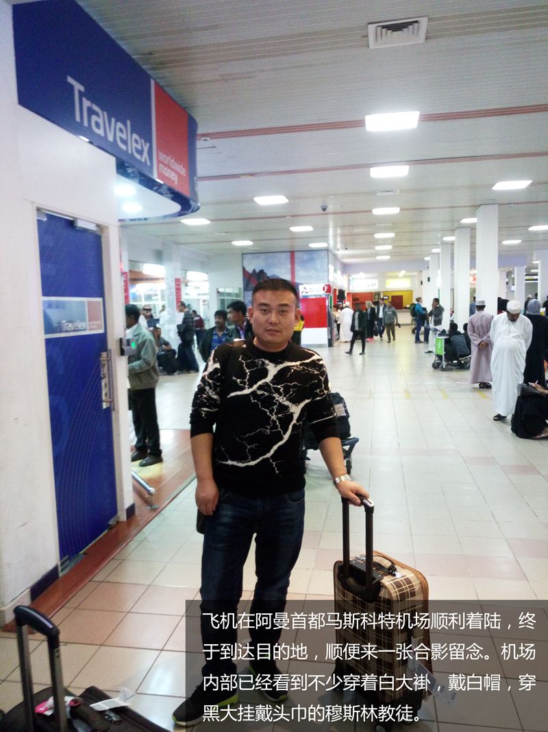 飛機在阿曼首都馬斯科特機場順利著陸,終于到達目的地,順便來一張合影留念。機場內部已經看到不少穿著白大褂戴白帽,穿黑大掛戴頭巾的穆斯林教徒。