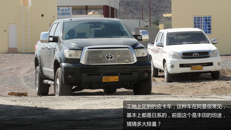 工地上見到的皮卡車,這種車在阿曼很常見,基本上都是日系的,前面這個是豐田的坦途,猜猜多大排量?
