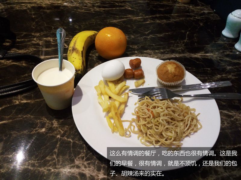 這么有情調的餐廳,吃的東西也很有情調。這是我們的早餐,很有情調,就是不頂饑,還是我們的包子、胡辣湯來的實在。
