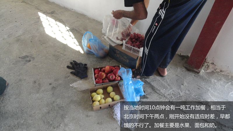 按當地時間10點鐘會有一噸工作加餐,相當于北京時間下午兩點,剛開始沒有適應時差,早都餓的不行了。加餐主要是水果、面包和奶。
