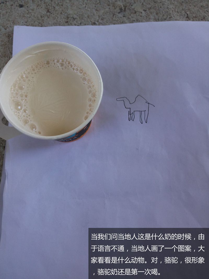 當我們問當地人這是什么奶的時候,由于語言不通,當地人畫了一個圖案,大家看看是什么動物。對,駱駝,很形象,駱駝奶還是第一次喝。