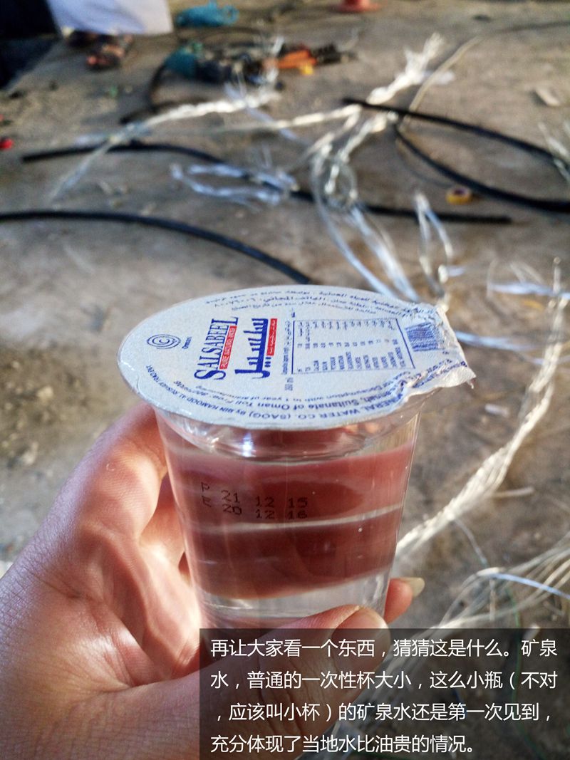 再讓大家看一個東西,猜猜這是什么。礦泉水,普通的一次性杯大小,這么小瓶(不對,應該叫小杯)的礦泉水還是第一次見到,充分體現了當地水比油貴的情況。