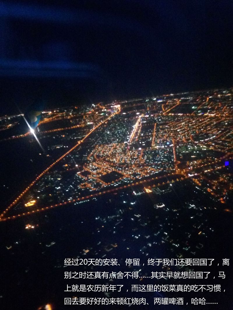 經過20天的安裝、停留,終于我們還要回國了,離別之時還真有點舍不得……其實早就想回國了,馬上就是農歷新年了,而這里的飯菜真的吃不習慣,回去要好好的來頓紅燒肉、兩罐啤酒,哈哈……