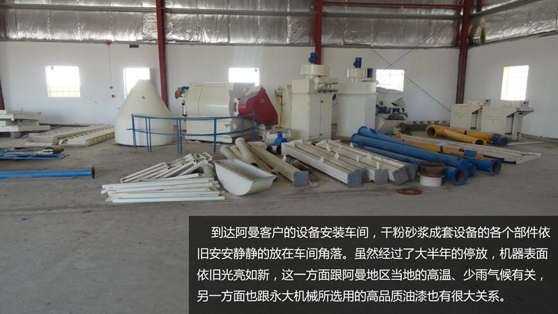 到達阿曼客戶的設備安裝車間,干粉砂漿成套設備的各個部件依舊安安靜靜的放在車間角落。雖然經過了大半年的停放,機器表面依舊光亮如新,這一方面跟阿曼地區當地的高溫、少雨氣候有關,另一方面也跟永大機械所選用的高品質油漆也有很大關系。