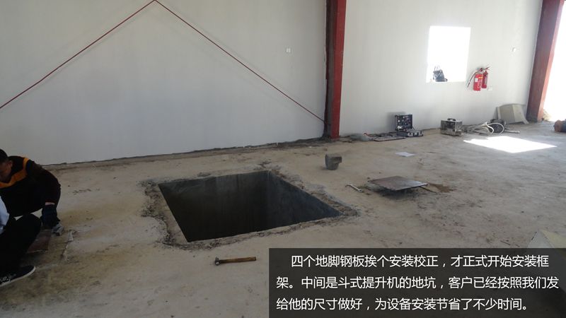 四個地腳鋼板挨個安裝校正,才正式開始安裝框架。中間是斗式提升機的地坑,客戶已經按照我們發給他的尺寸做好,為設備安裝節省了不少時間。