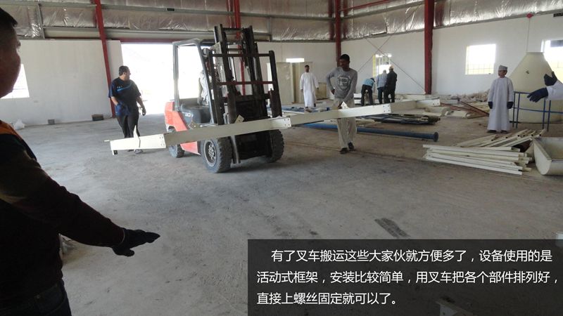 有了叉車搬運這些大家伙就方便多了,設備使用的是活動式框架,安裝比較簡單,用叉車把各個部件排列好,直接上螺絲固定就可以了。