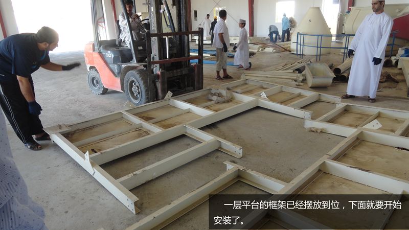 使用吊車將一層平臺吊裝到位,并已安裝完畢,永大機械技術人員與阿曼安裝人員溝通二層平臺的安裝細則。