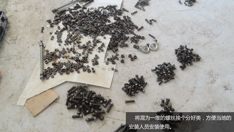 將混為一堆的螺絲挨個分好類,方便當地的安裝人員安裝使用。