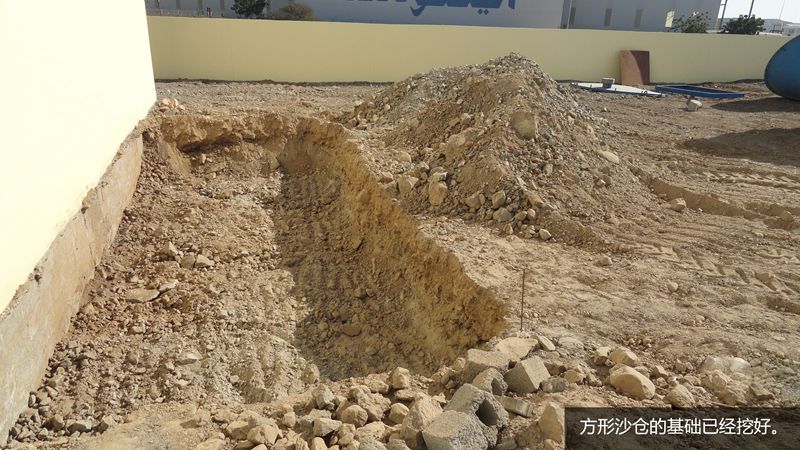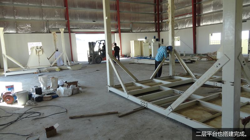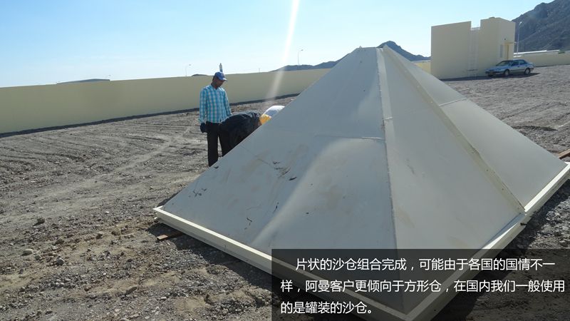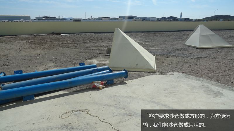 片狀的沙倉組合完成,可能由于各國的國情不一樣,阿曼客戶更傾向于方形倉,在國內我們一般使用的是罐裝的沙倉。