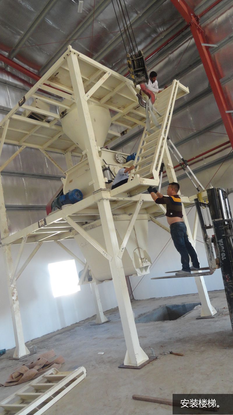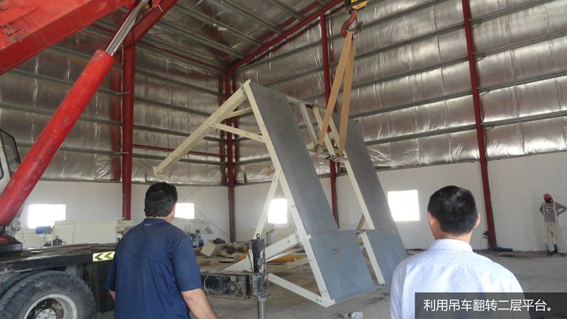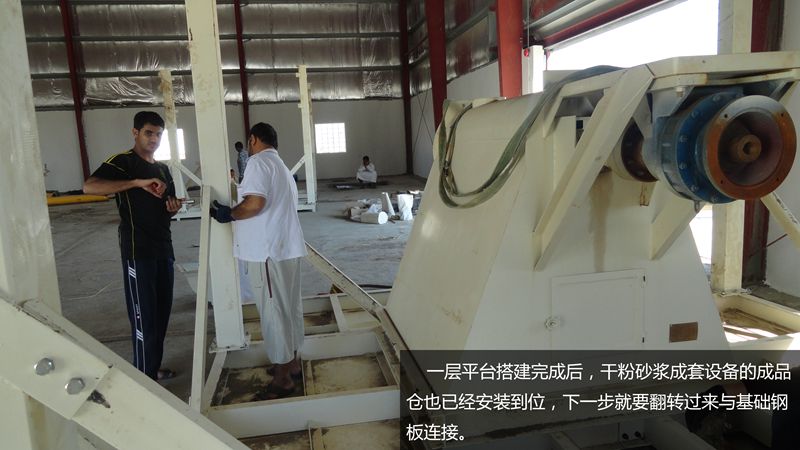 一層平臺搭建完成后,干粉砂漿成套設備的成品倉也已經安裝到位,下一步就要翻轉過來與基礎鋼板連接。