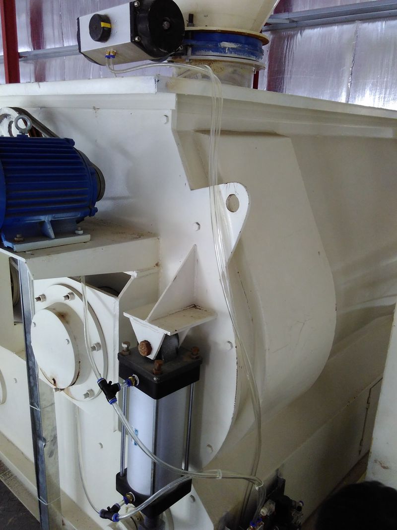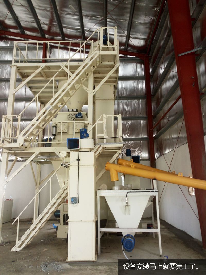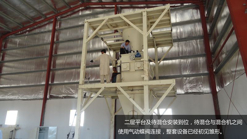 二層平臺及待混倉安裝到位,待混倉與混合機之間使用氣動蝶閥連接,整套設備已經初見雛形。