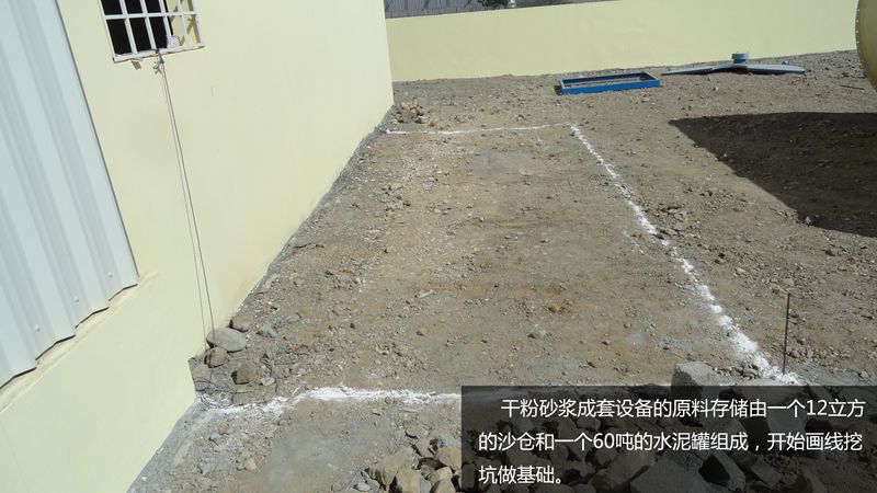 干粉砂漿成套設備的原料存儲由一個12立方的沙倉和一個60噸的水泥罐組成,開始畫線挖坑做基礎。
