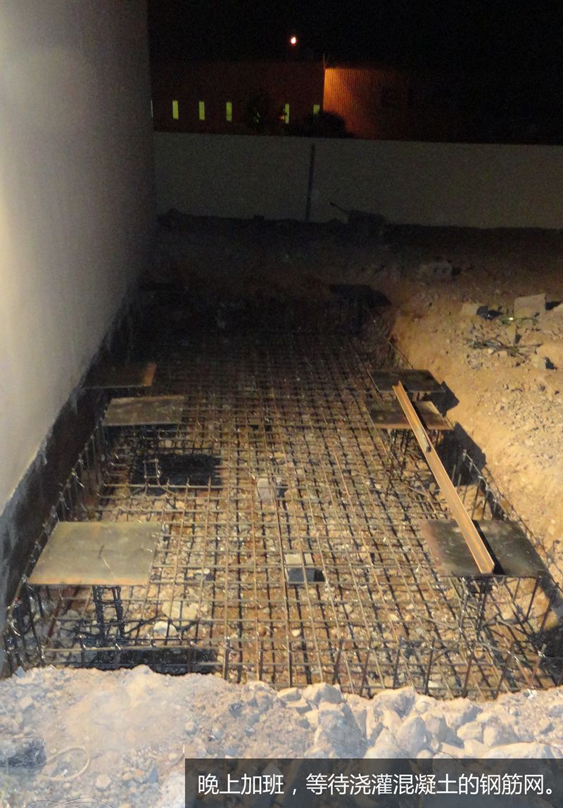 晚上加班,等待澆灌混凝土的鋼筋網。