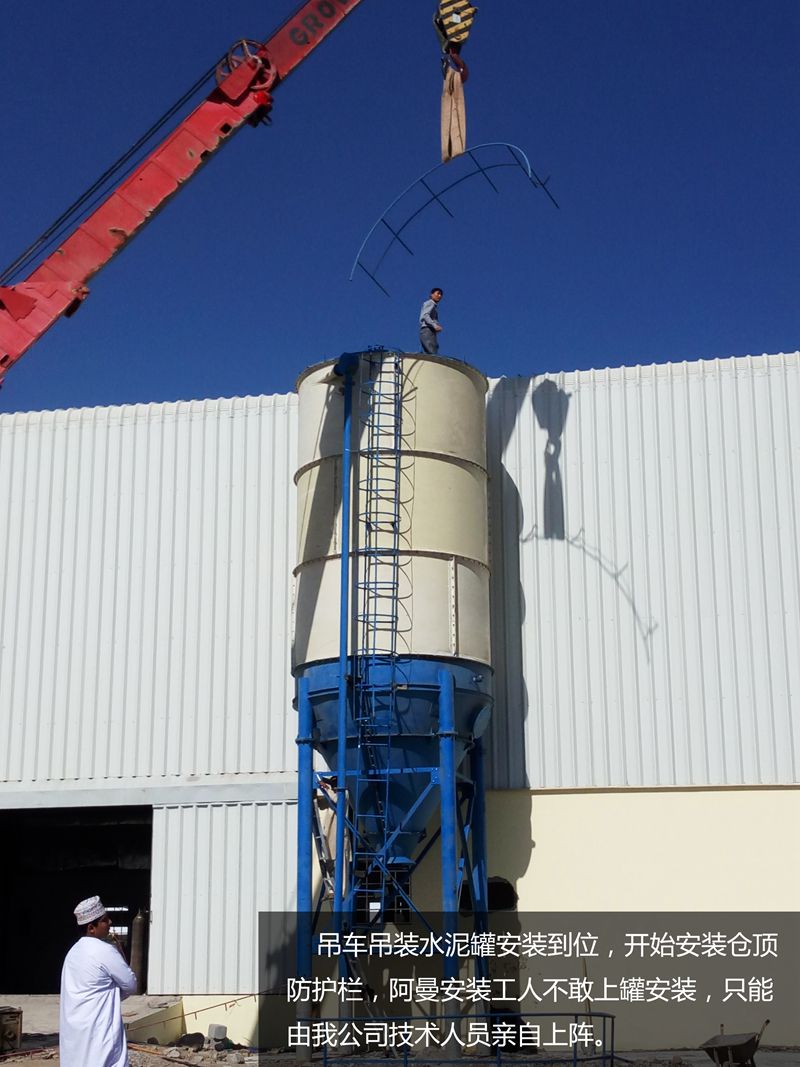 吊車吊裝水泥罐安裝到位,開始安裝倉頂防護欄,阿曼安裝工人不敢上罐安裝,只能由我公司技術人員親自上陣。
