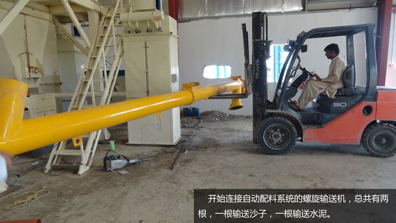 開始連接自動配料系統的螺旋輸送機,總共有兩根,一根輸送沙子,一根輸送水泥。