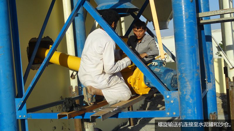 螺旋輸送機已經和沙倉、水泥罐連接好。